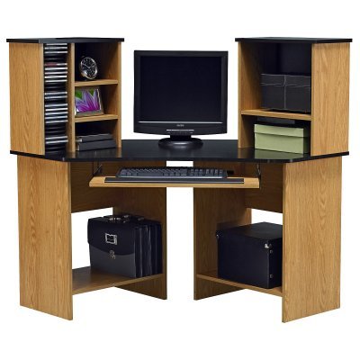 Make the most of the space in a small office with the Ameriwood Corner Computer Desk and Hutch in Oak and Black. This contemporary laminate over MDF desk combines a warm native oak finish with sleek black accents for a simple modern look. Designed to fit in a corner this desk provides ample desktop and storage space. The simple hutch features multiple shelves and a special spot designed for CD storage. The desk offers a pull-out keyboard shelf and space to accommodate most 19-inch monitors.About Ameriwood ProductsAmeriwood Industries is one of the leading manufacturers of wood products such as unassembled furniture stereo speaker cases and stereo component racks in the United States. For more than 30 years Ameriwood has helped furnish homes across North America with ready-to-assemble furniture. Crafted from engineered wood Ameriwood products are dense and durable for years of use.