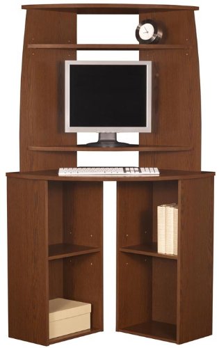 A hutch adds vertical capacity to this corner desk while supporting a 50-pound computer, has a pull out keyboard shelf and two adjustable shelves to provide plenty of open storage and is easy to assemble with household tools.